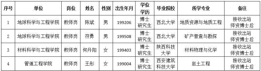 按照学校博士招聘工作安排,经院(系)对应聘人员的基本条件、思想品德以及业务能力的综合考核,学校审定,我校拟选聘下列人员来校工作。本着公平、公正、公开的原则,现将拟选聘人员的基本情况公示如下: